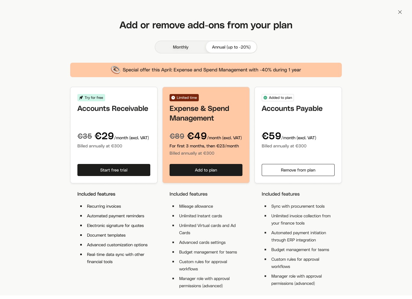 Add-on Management | "Try for free" vs promo badge hierarchy, clear pricing tiers | Existing customer eligibility |